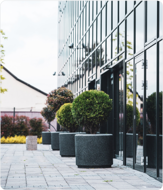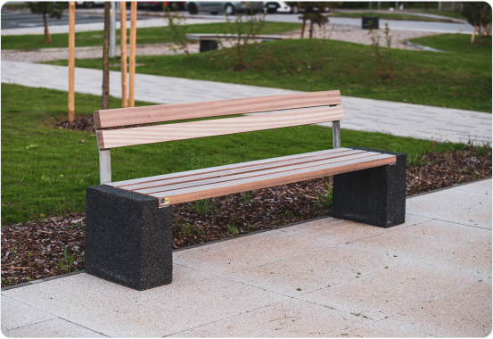 Park in dvorišče upravne zgradbe V osnovi je bila predvidena urbana oprema po meri, ki pa praviloma pomeni visoke proizvodne stroške. Na srečo so odkrili našo linijo Quadro, ki je bila oblikovno ustrezna, izdelamo pa jo lahko tudi iz drobljenega marmorja Nero Ebano. V kombinaciji s tropskim lesom se dobro povezuje z zasnovo celotnega kompleksa.
